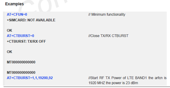 「AT+CTBURST=?」を確認したところ、初期のバージョンでは AT コマンドマニュアル通りの「+CTBURST=0-2,1-74,3000-65535,80-104,0-5」となっていましたが、現在のバージョンでは「+CTBURST: 0-2,1-74,3000-65535,0-30,0-5」となっています。